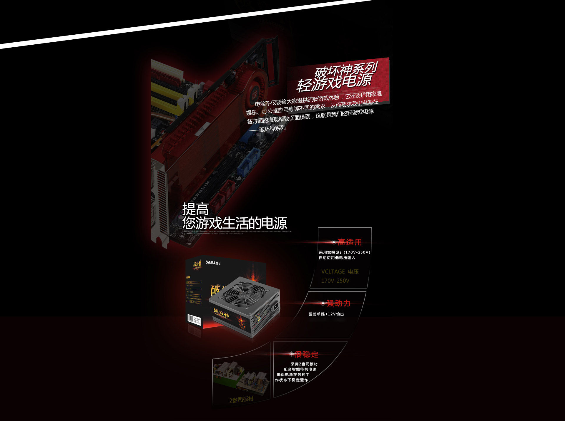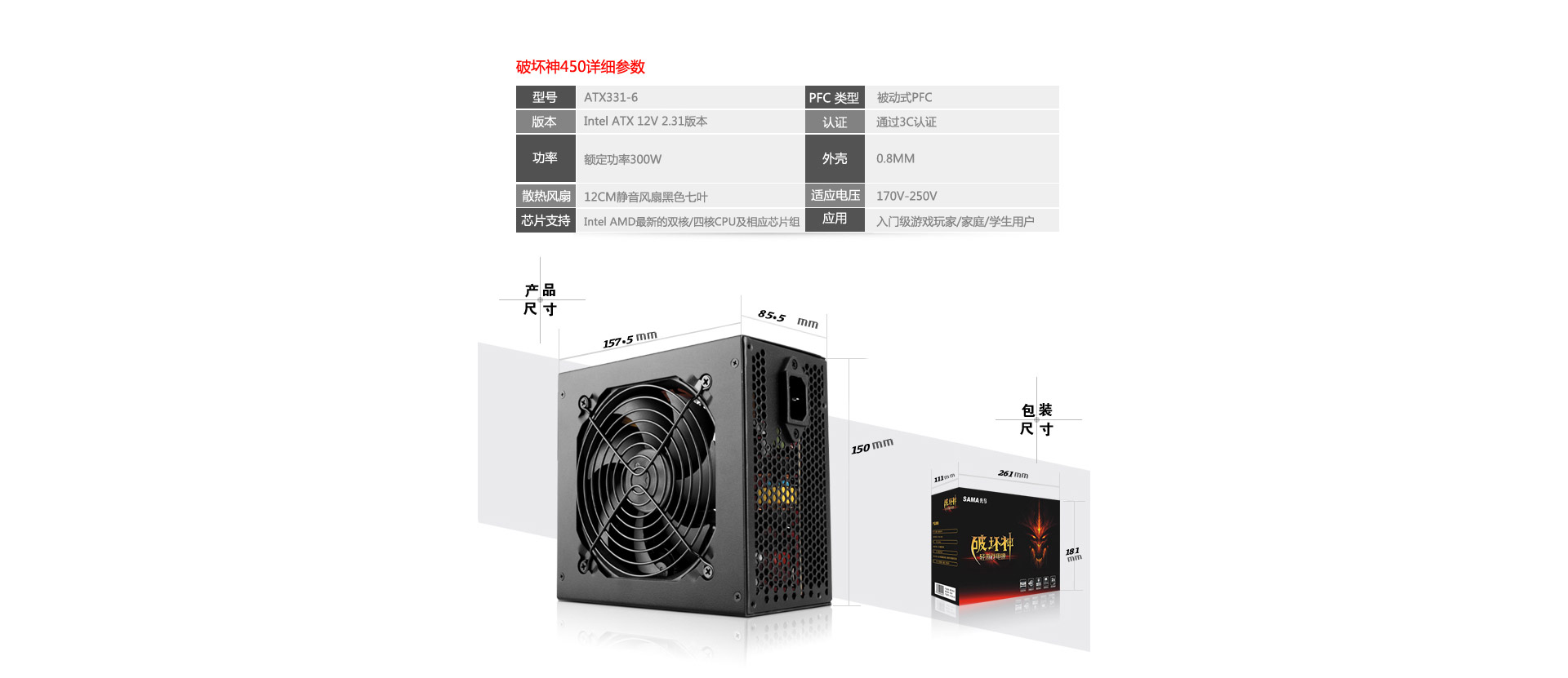 先馬SAMA 破壞神450入門(mén)游戲電源(額定300W,被動(dòng)PFC,單路+12V輸出,2盎司板材,U3電源)實(shí)標(biāo)功率,170V-240V寬幅設(shè)計(jì),高適應(yīng),強(qiáng)動(dòng)力,很穩(wěn)定,入門(mén)游戲電源