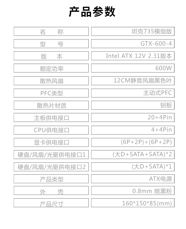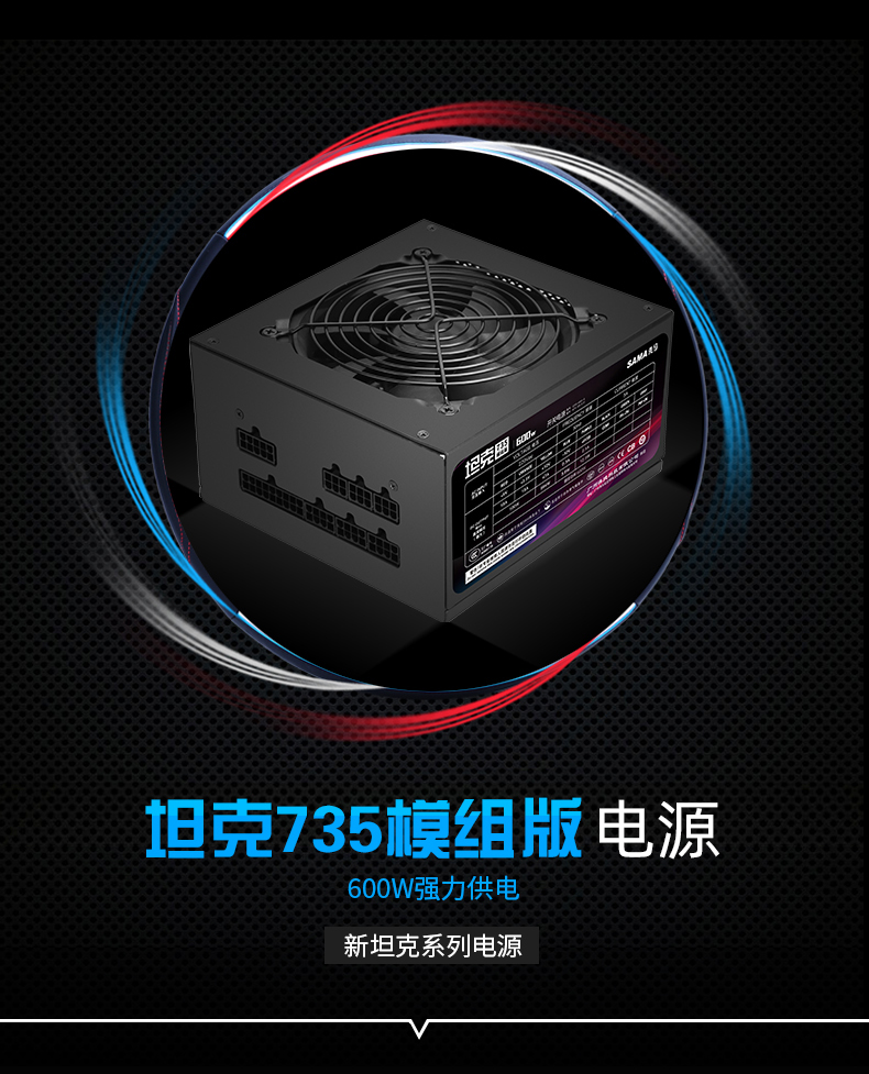 先馬SAMA 坦克735模組版(額定600W,全模組,主動(dòng)式PFC,12CM靜音散熱風(fēng)扇)額定功率不虛標(biāo),+12V輸出很強(qiáng)勁,12CM散熱風(fēng)扇清爽自在